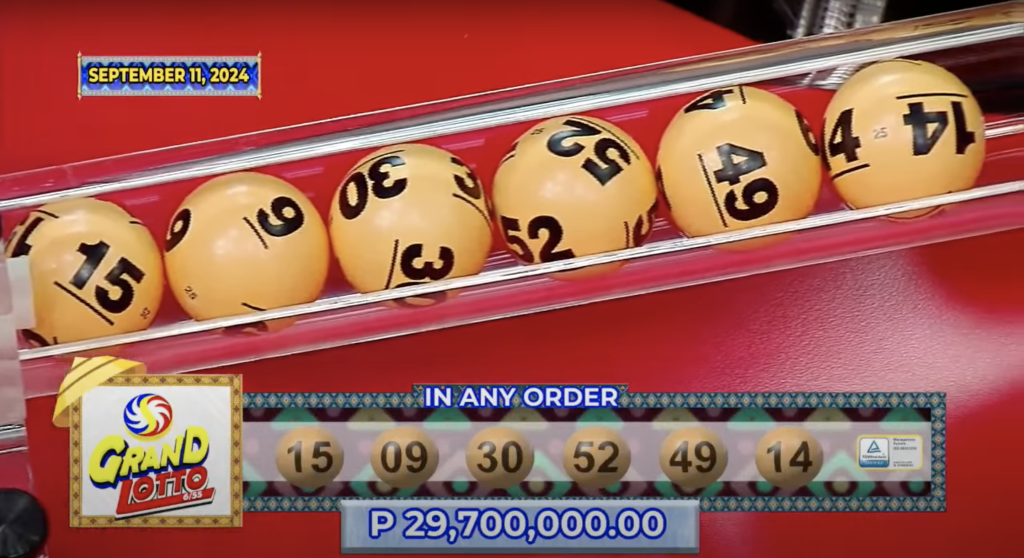 - Grand Lotto 6/55: 15-09-30-52-49-14